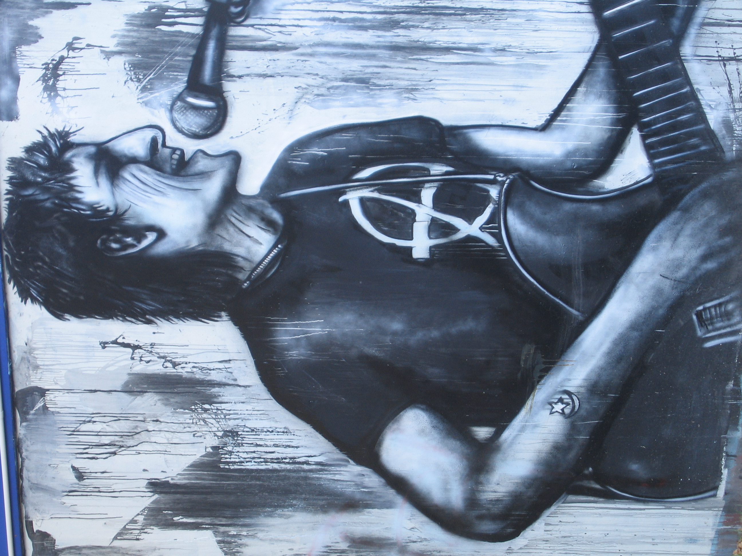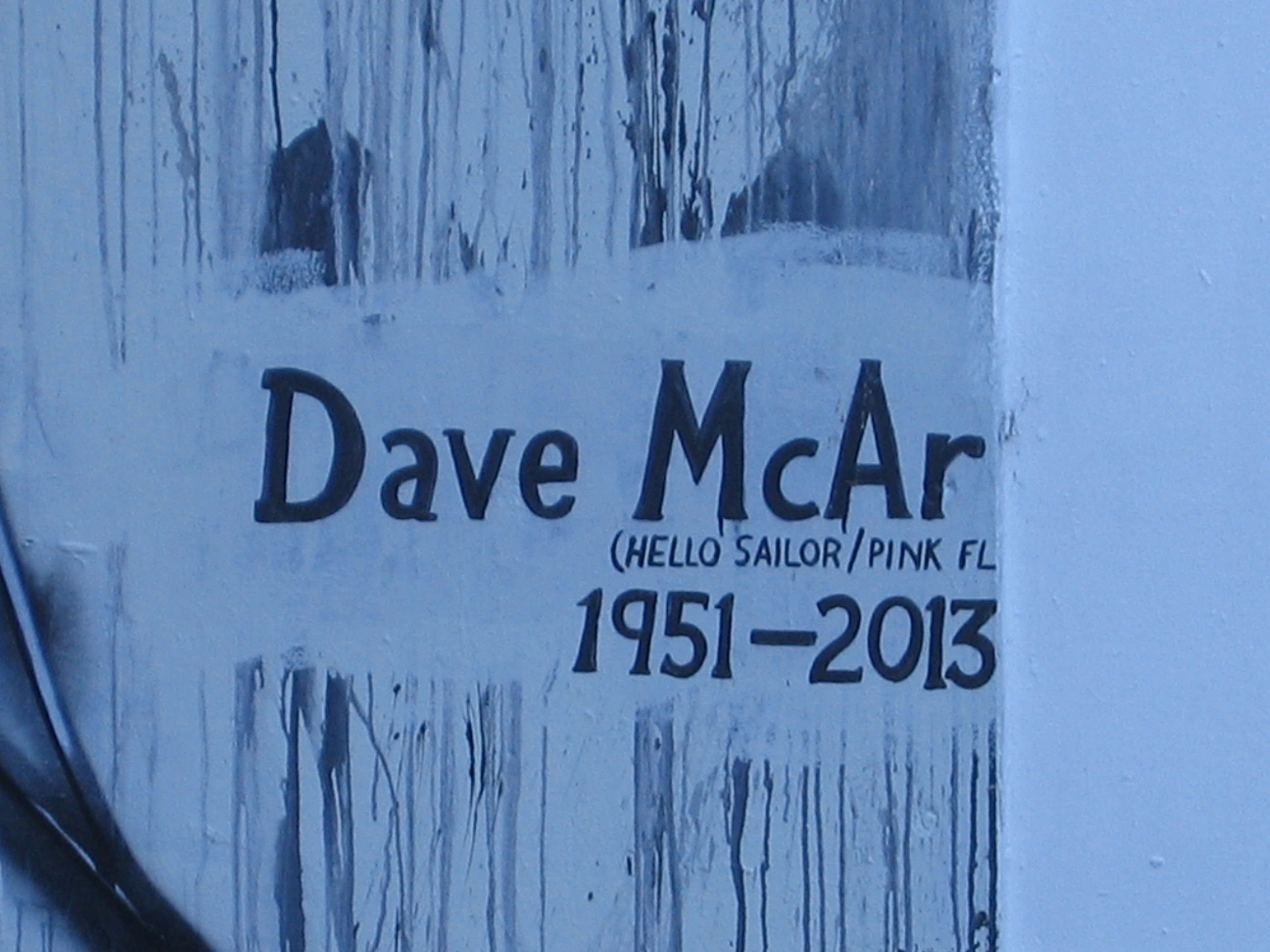 This is a mural of the musician Dave McArtney that is on the side of a music store on K Road and is on the wall facing the Jewish section of the Symonds Street Cemetery. Dave McArtney was in a New Zealand band called Hello Sailor and he died in 2013. It is by an artist called Paul Walsh.